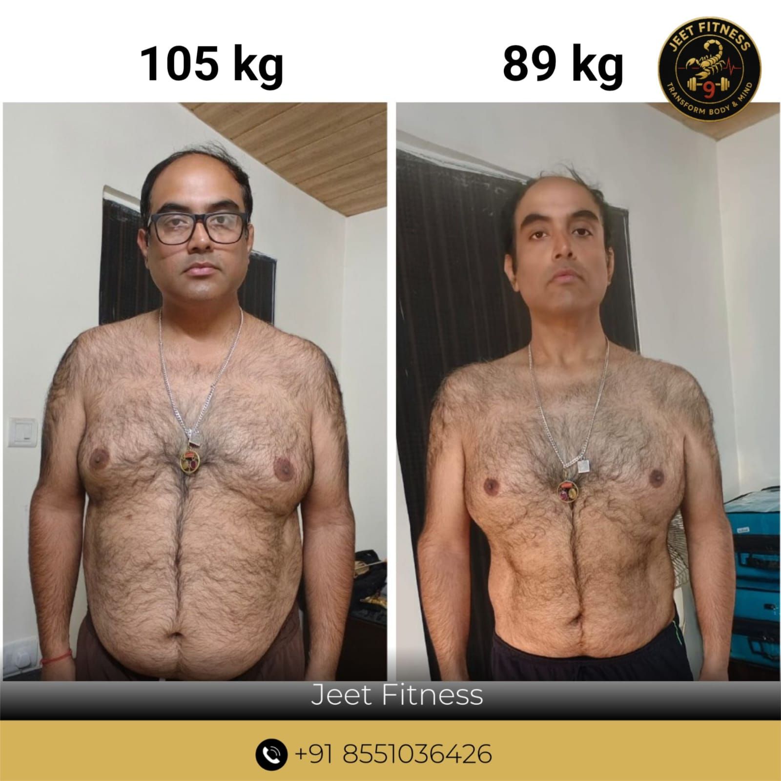 My fitness journey with Jeet Fitness has been truly transformative. When I started, I weighed 105 kg and struggled with low energy, lack of confidence, and an unhealthy lifestyle. With the personalized workout routines, proper guidance, and constant motivation from the team, I began to see gradual yet consistent progress.