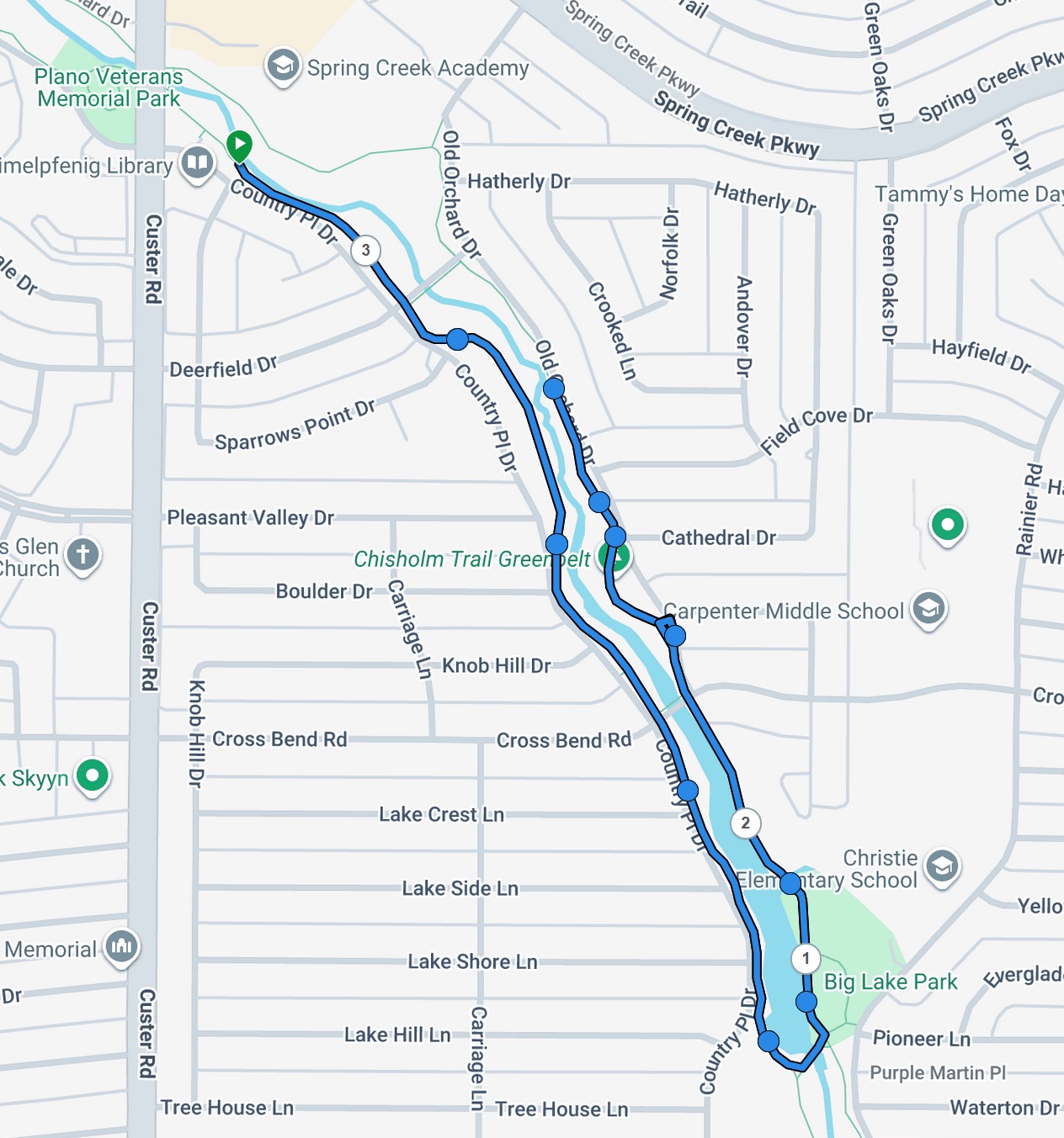 Our Tuesday night Prediction 5K Runs are held on Plano's Chisholm trail starting at Schimelpfenig Library located at 5024 Custer Rd, Plano. Chisholm trail is a cement sidewalk that runs on either side of Spring Creek. We register in the library parking lot. Click on the thumbnails below to see a full- sized version of the courses. Due to flooding and path closures we started running an out and back course in 2026.
